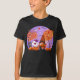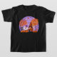 Camiseta de Halloween con un gnomo, fantasma, calabazas y árboles caídos con una luna morada en el fondo.