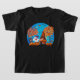 Camiseta de Halloween con un gnomo, fantasma, calabazas y árboles caídos con una luna azul en el fondo.