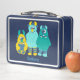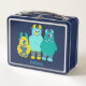 Esta botella de la lonchera es perfecta para los niños. Presenta monstruos personalizados tontos y está listo para ser personalizado con un nombre en letras azules debajo del gráfico. El gráfico y el nombre aparecen a ambos lados de la caja de almuerzo.