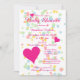 Elegante y colorido confeti atiende las invitaciones a la ducha para el chica. Personalizado fiesta invita con corazoncitos blancos. Diseño neutro adecuado para niños y chicas. Forma de corte personalizar. color de fondo personalizado, es decir aqua, amarillo, azul o rosa. Hermosa tipografía de escritura elegante con símbolos de amor vintage. Plantilla personalizable con RSVP y línea de registro. Tarjetas de ducha de bebé para mujeres embarazadas o madres. Colores azul y verde rosa pastel amarillo.