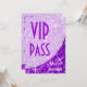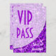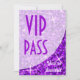 Invitación con un diseño moderno con estrellas diseminadas sobre una estilizada forma curvada "secuin look" en tonos violeta con "VIP Pass" escrito en color morado y blanco. Puede ser utilizado como fondo para su propio texto, imágenes e ideas. El texto puede cambiarse fácilmente con la plantilla proporcionada o con el botón "Personalizar" para realizar más modificaciones. Tenga en cuenta que esta es una imagen de arte digital impresa, no brilla ni contiene purpurinas o secuencias reales.