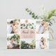 Comparte seis preciadas fotos de bodas con nuestro elegante y sencillo diseño de tarjetas de agradecimiento. Tus fotos están dispuestas en un collage alrededor de un elemento del centro rosa de color rosa que dice "gracias" en letras de guiones de caligrafía negra y pegadizas. Personalice con sus nombres debajo y agregue un mensaje preimpreso del personalizado al reverso.