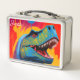 A colorful metal lunch box with a vibrant T-Rex dinosaur graphic, personalized with a custom name.