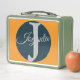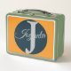 Modern custom orange Light ocean blue Monogram metal lunch box.