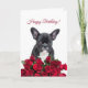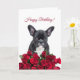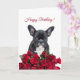 Bulldog francés lindo deseando tarjeta de cumpleaños feliz con rosas rojas.