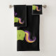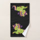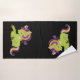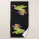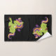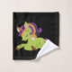 Toalla con la imagen de un unicornio de estilo Frankenstein. Colores púrpura y verde. Qué lindo.