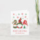 Cuidada tarjeta de vacaciones plegada personalizada que incluye tres gnomos de estilo escandinavo con gorras rojos y verdes de temporada y túnica bajo copos de nieve rojos, verdes y dorados. Personalice el saludo de "Feliz Navidad" (por ejemplo, "Felices Fiestas") en tipografía roja divertida y su nombre en la parte inferior. Añadir un mensaje dentro o dejar en blanco.