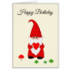 Tarjeta de cumpleaños de gnomo feliz con corazón y tréboles de cuatro hojas. El texto se puede personalizar.