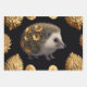 Cute Papel De Envoltura Colorido De Hedgehog . Hedgehog parado en medio del papel con hojas de oro y plata alrededor. Corta pequeñas hojas de papel de envoltura natural y de vida silvestre. Los niños escriben para su cumpleaños u otro.