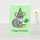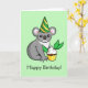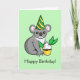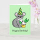 Celebra tu cumpleaños al verdadero estilo australiano con este adorable koala en un gorra verde y fiesta. ¡Incluso tiene un pequeño pastel de cumpleaños hecho con hojas de eucalipto!
