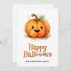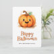 Halloween feliz con un lindo ilustracion acuarela de una calabaza sonriente. Personaliza fácilmente esta tarjeta de Halloween para los niños con tu nombre y texto familiar.