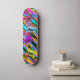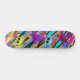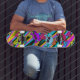 Los calaveras y corazones multicolores se colocan sobre un fondo colorido. ¡Este diseño de cráneo brillante será un skateboard salvaje!