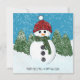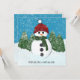 Un muñeco de nieve alegre y super lindo con una abeja roja y una bufanda verde parados frente a un bosque de pinos mientras está nevando. Este ilustracion se inspiró en las muchas familias de hombres de nieve que hacen cuando visitan la cordillera Escudo de Los Ángeles durante los pocos días que hace suficiente frío para nevar en las citadas montañas del sur de California. Personalizar y personalice Feliz Navidad y Feliz Año Nuevo en el frente, así como el mensaje, los destinatarios y los nombres de los remitentes en la parte posterior de la tarjeta.