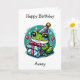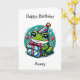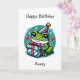 Una tarjeta de cumpleaños para ella. Una rana linda con un regalo de cumpleaños rosado. En el interior de la tarjeta hay una bonita página de color con una rana sobre una almohadilla de lirio y mariposas. La derecha interior tiene un lindo juego de palabras.