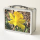 Fotografía de un hermoso daffodil amarillo en el jardín con texto personalizado