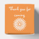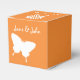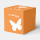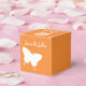 Dé a tus invitados, damas de honor, padrinos o a cualquier otra persona un regalo especial con estas cajas de personalizable con un fondo naranja brillante con una mariposa de cola de toronja blanca, una mariposa monarca y margarita en la parte delantera, trasera y superior de la caja. Cada uno de estos lados también incluye un texto de ejemplo que puede personalizar para su propio boda o evento con tema de primavera. No olvide consultar los demás productos del Naranja Daisies and Butterflies para crear una imagen verdaderamente coordinada para su evento.