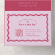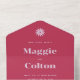 Estas invitaciones nupciales presentan un color viva magenta atrevido, emparejado con un púrpura lila claro, creando una estética vibrante y juguetona. El borde de la ola retro añade un toque de nostalgia y añade un elemento divertido y único al diseño. Las invitaciones vienen en múltiples opciones de color, dándole la flexibilidad para crear un aspecto cohesivo para su día especial. La papelería de coordinación está diseñada para mezclar y emparejar, lo que le permite crear una apariencia personalizado y coordinada para su boda.