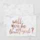 Una tipografía moderna, original y chic de lettering a mano con pincel en hoja de oro rosa falso ¿serás mi dama de honor? tarjeta en un elegante y simple fondo de mármol blanco de moda