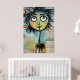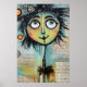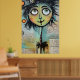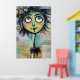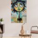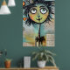 Un carácter caprichoso, con ojos grandes y expresivos y una cabecera colorida y pluvial, domina el primer plano frente a un collage de textos escritos y elementos abstractos en el fondo. La figura tiene un encanto peculiar, con sus características desproporcionadas y sus colores vivos.