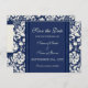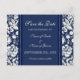 La boda ahorra las postales de la invitación de fecha en un elegante patrón de damasco floral color crema y azul marino oscuro, elegante y completamente personalizable con los detalles de su boda. También disponible en muchos otros productos para la fiesta de boda.