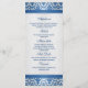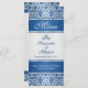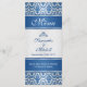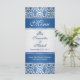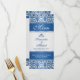 Patrón de damasco azul oscuro en una tarjeta de bandeja del menú Boda de fondo de gradiente plateado.