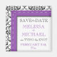 Moderno y de moda Guardar el imán de fecha para su Boda. Presenta un diseño/ilustracion de costura púrpura sobre un patrón de damasco blanco y negro.