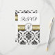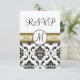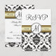 Elegante y sofisticada tarjeta de respuesta para boda con estampado damasco en negro y blanco con acento dorado que puedes personalizar. Un hermoso fondo con patrón damasco se acentúa con un adorno circular y monograma sobre una línea con efecto metálico dorado que contiene los nombres de los novios. Efectos de Photoshop con sombras dan a esta tarjeta una apariencia 3D impresa directamente en el papel de tu elección. Diseño de tarjeta de respuesta de boda por Elke Clarke ©2010, 2012. Gráficos licenciados. Una forma elegante de establecer el tema de tu boda. Personaliza con los detalles de tu boda y la información de la tarjeta de respuesta para tener la colección perfecta de invitaciones de boda.