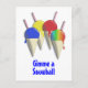 Esta postal muestra una imagen de hielo afeitado de cuatro conos de nieve: rojizo, azul, amarillo y un arcoiris afeitan hielo. Dice, "Dame una bola de nieve" con una letra azul que parece que tiene nieve en ella. Puede cambiar esto en la plantilla si desea personalizar la camiseta.