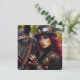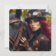 Una impresionante dama victoriana de vértigo oscura, con ojos azul penetrante, cabello rojo, gafas y sombrero de punta, se alza junto a su magnífico caballo negro con ropa de cuero y engranajes de reloj en un reino histórico de vértigo.