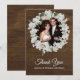 Elegante carta de agradecimiento de boda de moda rústica de estilo plano, con la foto de su personalizado enmarcada con gráficos de una corona floral del aliento del bebé sobre un fondo de madera oscura. Personalice el texto blanco del personalizado y reemplace la foto de ejemplo con la suya propia. Hay productos bodas que coinciden.