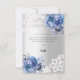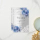 Una carta de agradecimiento moderna y elegante. Un fondo falso plateado. Decorado con rosas azules, flores, encaje y cruz. Parte posterior: plantilla para una nota de agradecimiento y un nombre.