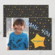 Una tarjeta de agradecimiento de cumpleaños para tus amigos y familia. Sube tu foto y personaliza la tarjeta con tu nombre. Esta tarjeta de agradecimiento de niño tiene un lindo patrón de estrella amarilla en la parte delantera y trasera. El nombre está en medio de una gran estrella amarilla. Excelente como tarjeta de agradecimiento para los chicos.