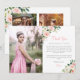 Una tarjeta de agradecimiento de quinceañera que incluye gráficos florales de acuarela en tonos rosa, blanco y verde y un tipo de letra moderno. Hay espacio para una foto al frente y dos al revés y esta es la manera perfecta de agradecer a sus invitados por asistir a su celebración de mis quince. Parar con cualquier cosa de la colección de RUBOR para tener un aspecto cohesivo.