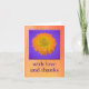 Diseño contemporáneo - Naranja dahlia en plaza morada, "con amor y gracias" debajo. Fondo de color amarillo a oscuro naranja. en blanco dentro para su nota de agradecimiento, o al personalizar.