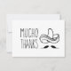 ¡Muchas gracias! Esta linda tarjeta de 5 x 3,5 pulgadas Gracias cuenta el texto que dice "Mucho Gracias" con un sombrero chippy y bigote. La parte posterior se deja en blanco para que se pueda escribir en ella.
