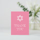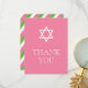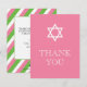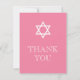 Esta tarjeta judía de agradecimiento se empareja maravillosamente con VG invita a Chica de Ceremonia Religiosa conjunto de invitaciones. Presenta una Estrella de David con un fondo rosado precoz. En la parte trasera encontrarás tiras rosas y verdes y una sección para añadir tu saludo personal. Consulte www.zazzle.com/vginvites para obtener una invitación y sobres coincidentes.