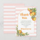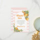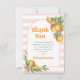 Naranja Citrus Little Cutie Primer cumpleaños Tarjeta de agradecimiento Cute nuestro pequeño cutie primer cumpleaños carta de agradecimiento con algunos elementos de cítricos y florales, arco blanco y fondo rayado rosado y blanco.