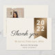 Gracias, merci, grazie, arigato, o danke, di gracias con esta tarjeta de graduación de 5" x 7". Con un Relieve metalizado falso dorado sobre un fondo de marfil junto con un marcador de posición para tu foto favorita en la parte de atrás y una amplia sala para escribir tu mensaje de agradecimiento.