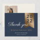 Gracias, merci, grazie, arigato, o danke, di gracias con esta tarjeta de graduación de 5" x 7". Con un Relieve metalizado falso dorado sobre un fondo azul marino junto con un marcador de posición para tu foto favorita en la parte de atrás y una amplia sala para escribir tu mensaje de ‘gracias’.