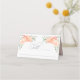 Bonita tarjeta de boda contemporánea plegada con ramos claros y ventilados de peonías acuáticas y rosas en tonos melocotón, rosa y blanco cremoso. La parte delantera de la tarjeta de lugar tiene texto formal en un guión elegante florece con espacio para escribir en los números de la tabla. Se muestra una línea en blanco para escribir en los nombres de invitados. El lado inverso de la tarjeta de lugar tiene un mensaje especial junto con los nombres de la novia y del novio que puede personalizar editando el texto de ejemplo que se muestra en la plantilla de diseño.