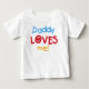 Camisetas Daddy Loves Me, bodysuits, imanes, tarjetas, stickers, bolsas de mano, stickers y otros artículos con diseño de texto en azul, rojo y amarillo y pequeño corazón rojo que dice Daddy Loves Me!
