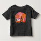 Camiseta pequeña de Halloween con un gnomo, fantasma, calabazas y árboles caídos con una luna rosa en el fondo.