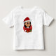 Diseño con el ilustracion de una linda y sonriente chica feliz con el pelo castaño largo, lleva disfraz rojo y blanco de Santa Claus y tiene un regalo; vacaciones de Navidades con fondo blanco