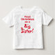 La primera camiseta de Navidad para hermanos presenta la frase, "Primera Navidad como "Hermana Mayor!" en letras rojas brillantes. Un sombrero de Santa se muestra equilibrándose en el borde de la letra "S" de Sister y una corona de Navidad cuelga juguetonamente al final de la palabra Navidad. Pequeñas motas verdes y rojas se muestran por todas partes. Diseñado para acompañar la colección "Primera Navidad".