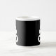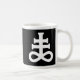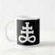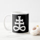 Goce de su bebida de la opción con el blanco doble clásico en la taza blanca adornada símbolo negro del azufre. El símbolo del azufre fue utilizado por Antón Szandor LaVey en la cima de las 9 declaraciones satánicas en la biblia satánica.