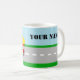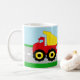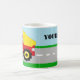 Los colores primarios adorables y frescos son el elemento clave en este taza linda estupenda de la taza del tema de la construcción del dumptruck de los niños o de los muchachos, con su nombre personalizado. Ofrece un camión volquete del trabajo con un cuerpo rojo, tiradas amarillas de la cama de la descarga y de la rueda, y un extractor y parachoques grises. El fondo contiene una carretera de asfalto gris con las marcas blancas, el verde para la hierba y el azul para un cielo. Un gran tema para los comercios de la fiesta de cumpleaños de los muchachos, del constructor y de edificio o una decoración grande del sitio del tema de la máquina de los niños. Todo diseña el © de Copyright www.CustomInvitesOnline.com 2012