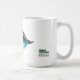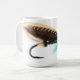 La imagen hermosa de una mosca de color salmón de la pesca del encanto azul imprimió en una taza blanca llana