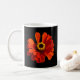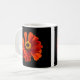 Una taza con una foto de una flor de margarita roja en un fondo negro