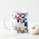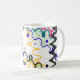 Squiggles digitales coloridos y ondas del arte en una taza blanca. Muy moderno y artístico…