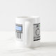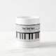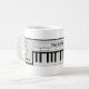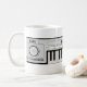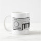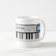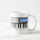 Una taza adaptable con un diseño del teclado del sintetizador. El sintetizador tiene un teclado de piano, los botones del control y botones. Un indicador digital azul tiene un área de texto adaptable.